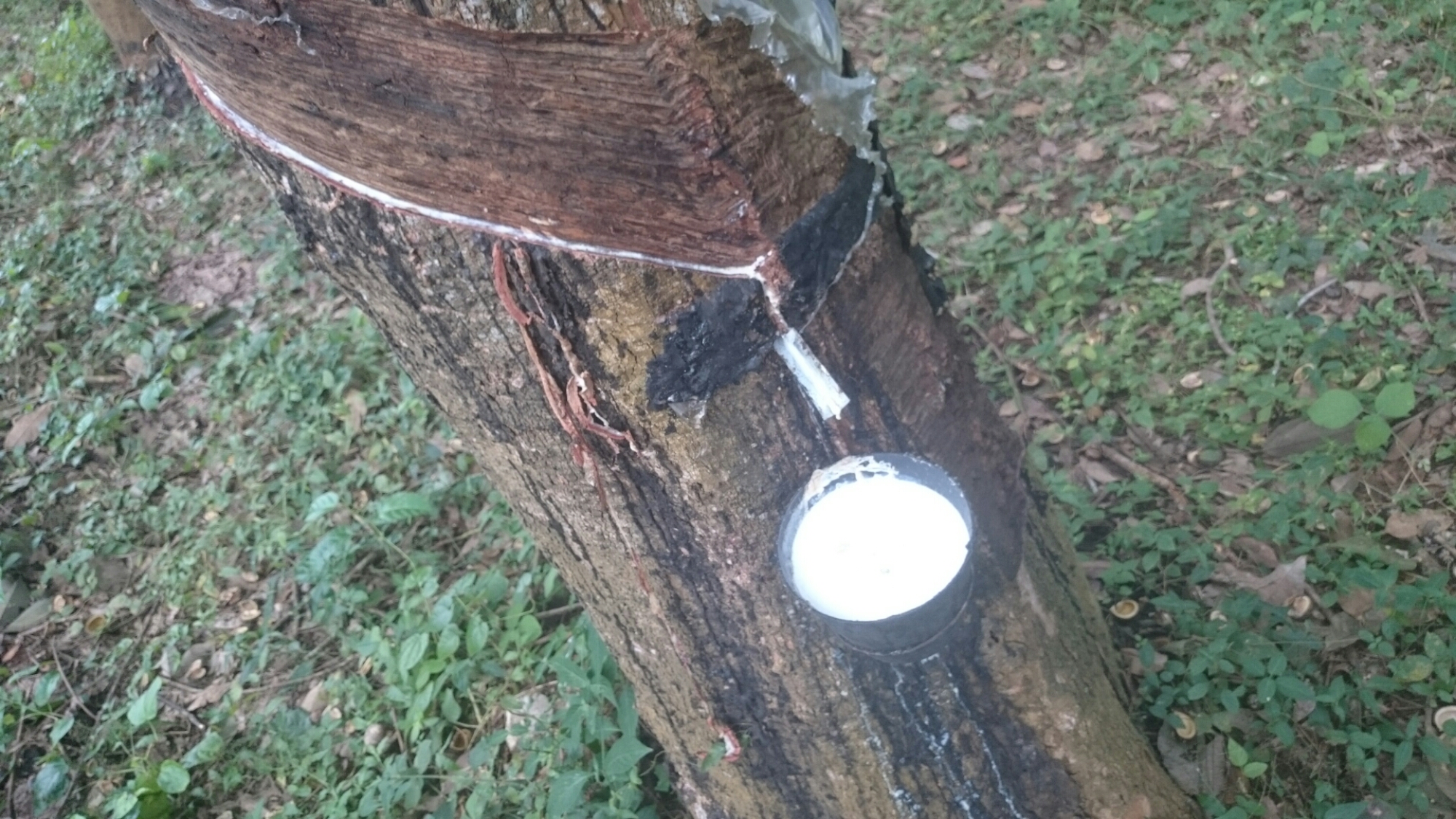 Efter dagens første 80km nåede jeg endelig til nedkørslen ned fra højderne. Nede i varmen igen, gik vejen gennem en kæmpestor gummiplantage (skov er det vel nærmere). Jeg kunne simpelthen ikke i min nysgerrighed lade være at gå hen og stikke fingeren ned i en af de små skåle der opsamler gummien fra barken. Det havde en lidt anden konsistens end forventet og jeg kom til at plaske gummi ud over mig selv.