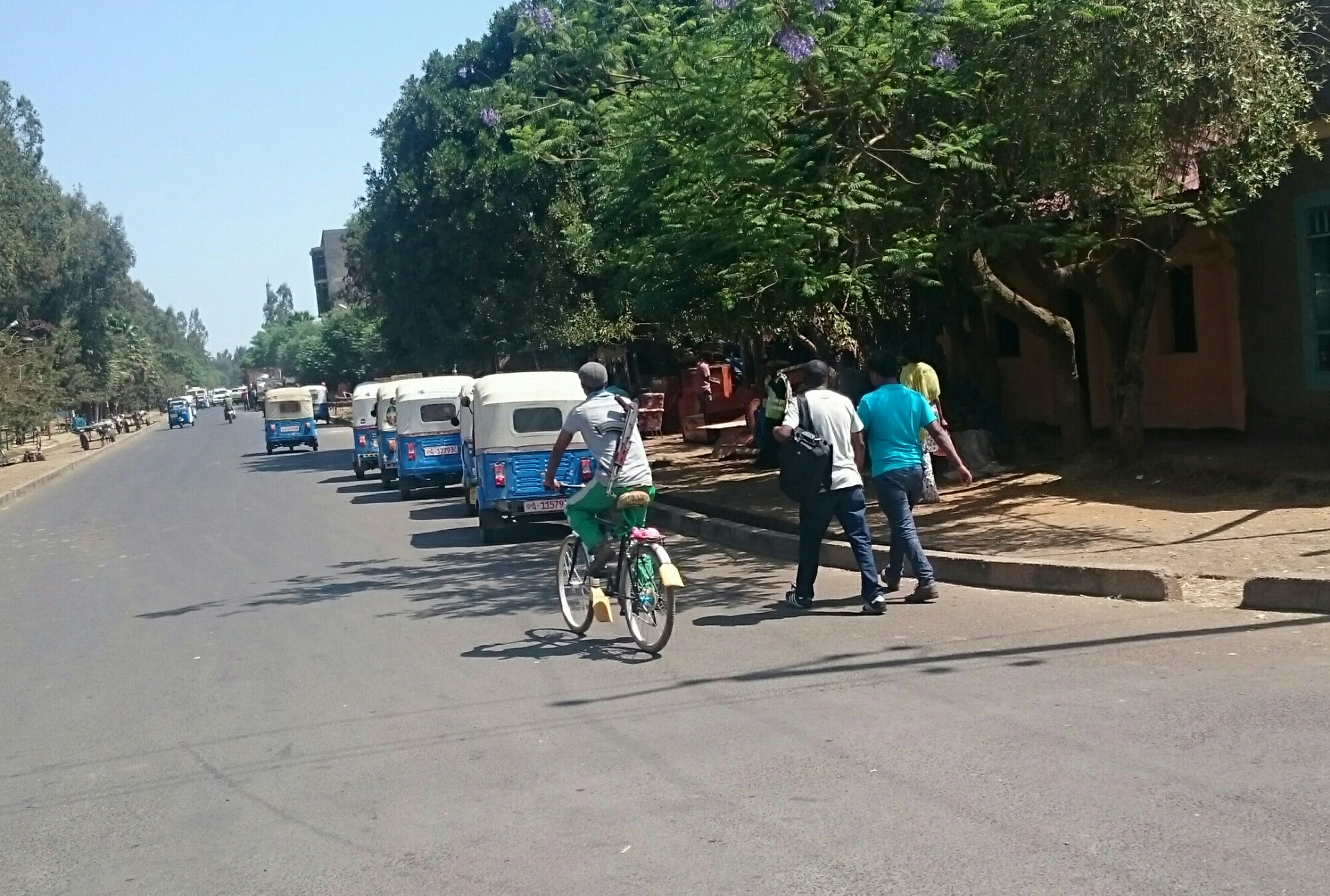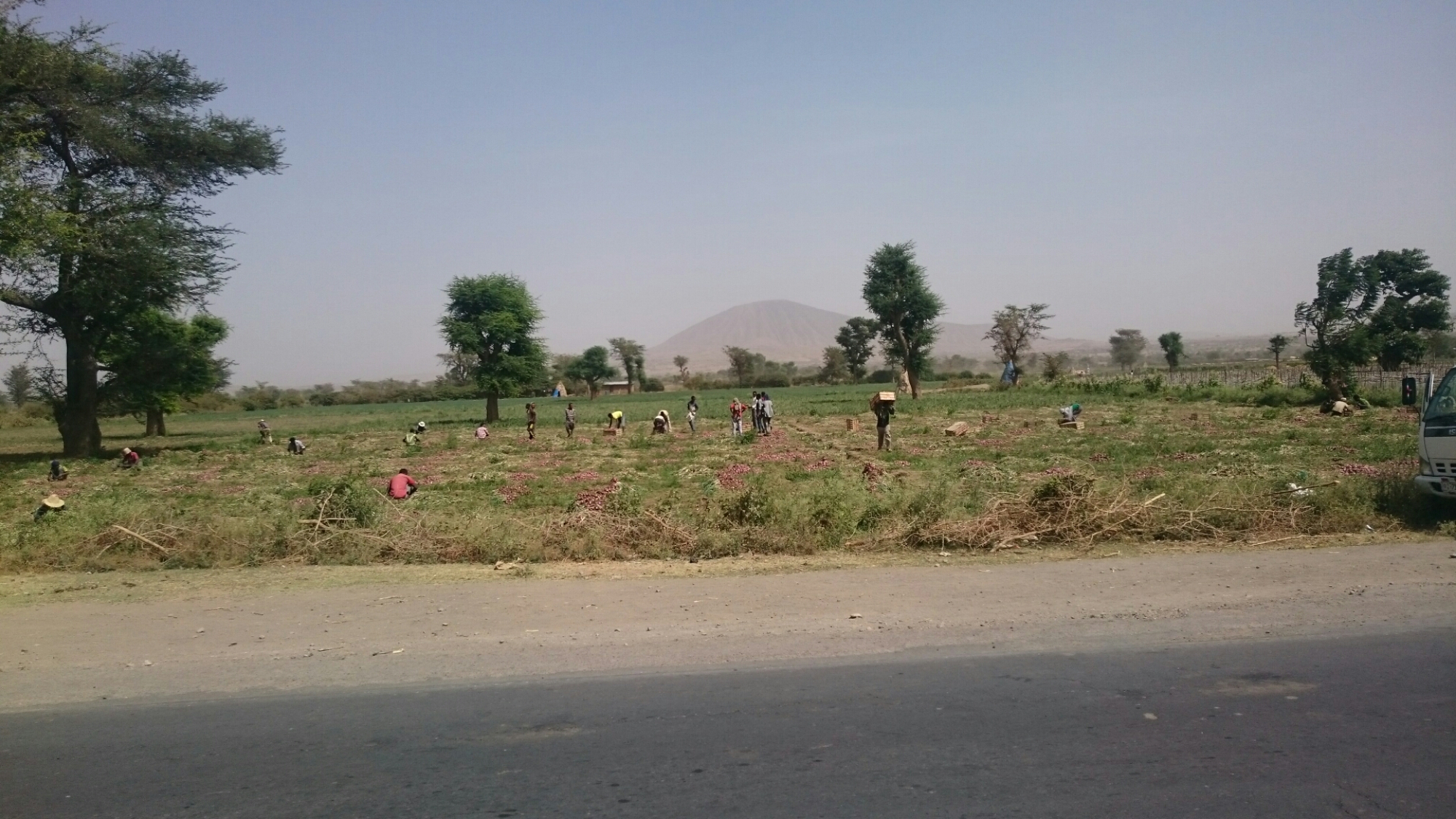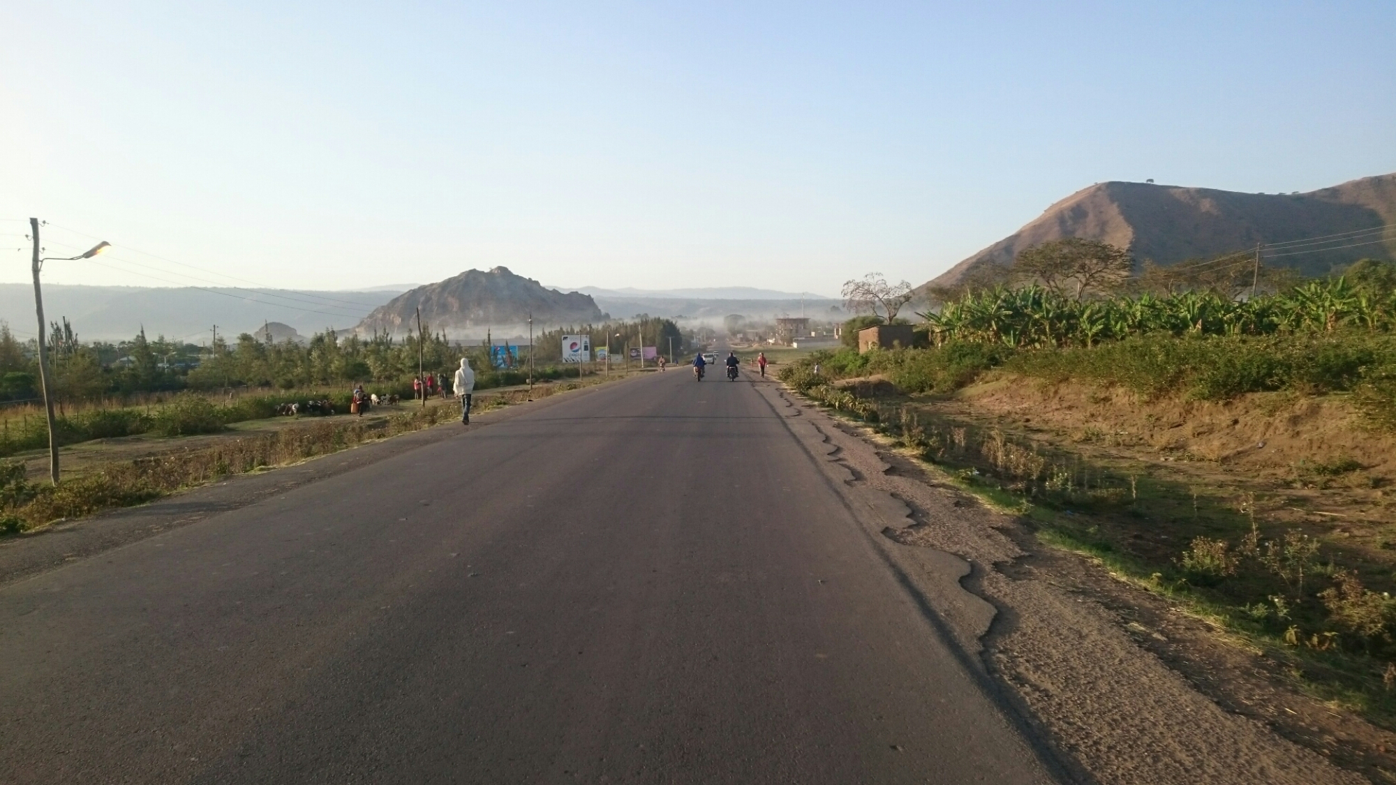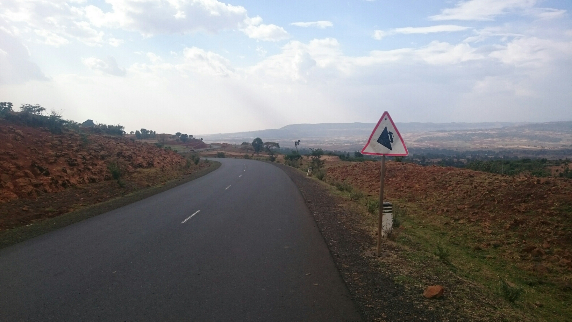 Trafikken var helt skør de først 25 kilometer, heldigvis så skør at den nærmest stod helt stille, så nød forhindringsbanen mellem de køholdende biler, nød dog ikke den ulidelige larm og os (tung blå eller sort røg fra helt trætte benzin- og dieselmotorer) så meget. Efterhånden var jeg ude på landet igen som jeg kender det, dyr og børn på vejene. Dagens  første 73 kilometer var i en lidt strid side-modvind mens resten var i en skøn medvind der fik mig til at tænke på de flyvende ture oppe i Sudan. For første gang i mange dage har det også været stort set fladt, befinder mig 700 meter lavere end Addis nu (så helt fladt var det nok ikke). Samtidig er det helt vildt støvet, man kan ikke se ret langt.