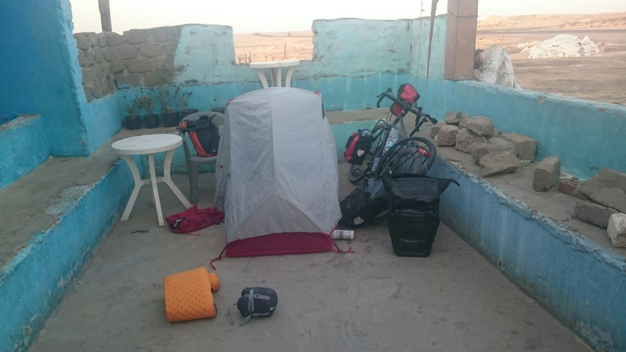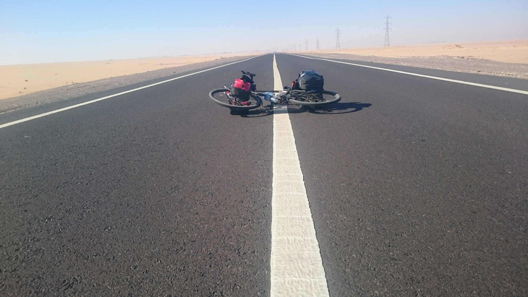 Efter allerede 60km kom en af de værste kriser på turen. Efter en 1cm revne i den ellers skønne vej gav den højre bolt på bagagebæreret op og det hele kollapsede. Lavede dog en cowboy-løsning af dimensioner, skruede to løse skruer i de huller der førhen holdt skærmen og bandt med noget elastik det hele sammen. Det var mens jeg fiksende bagagebæreret at jeg fandt ud af at jeg havde sprunget en eger i baghjulet (højest sandsynligt på den dårlige vej fra et par dage siden). For ikke at overbelaste baghjulet ville jeg så flytte noget vægt over på forhjulet. Det var i denne proces at jeg fandt ud af at en af mine halvanden liter vandflasker var sprunget i min taske, ikke fedt når man er midt i ørkenen. Sahara 3, Ingmar og cykel 0. Tænkte for første gang på turen at det faktisk kunne gå hen og ende helt helt galt, det var fortsat tidligt om morgenen så var eneste levende væsen i ørkenen. Ved ikke om det var dumhed eller determination, men pløjede svært nervøs videre.