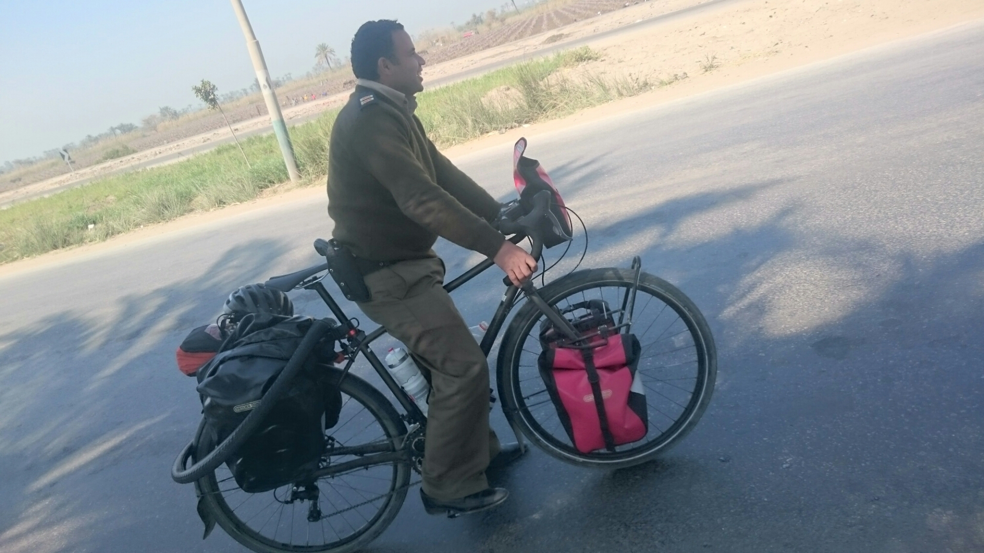Km 67: ny politibil ankommer, får på mit bedste arabisk forhandlet mig til at blive på cyklen, bilen følger i røven på mig – super stressende.