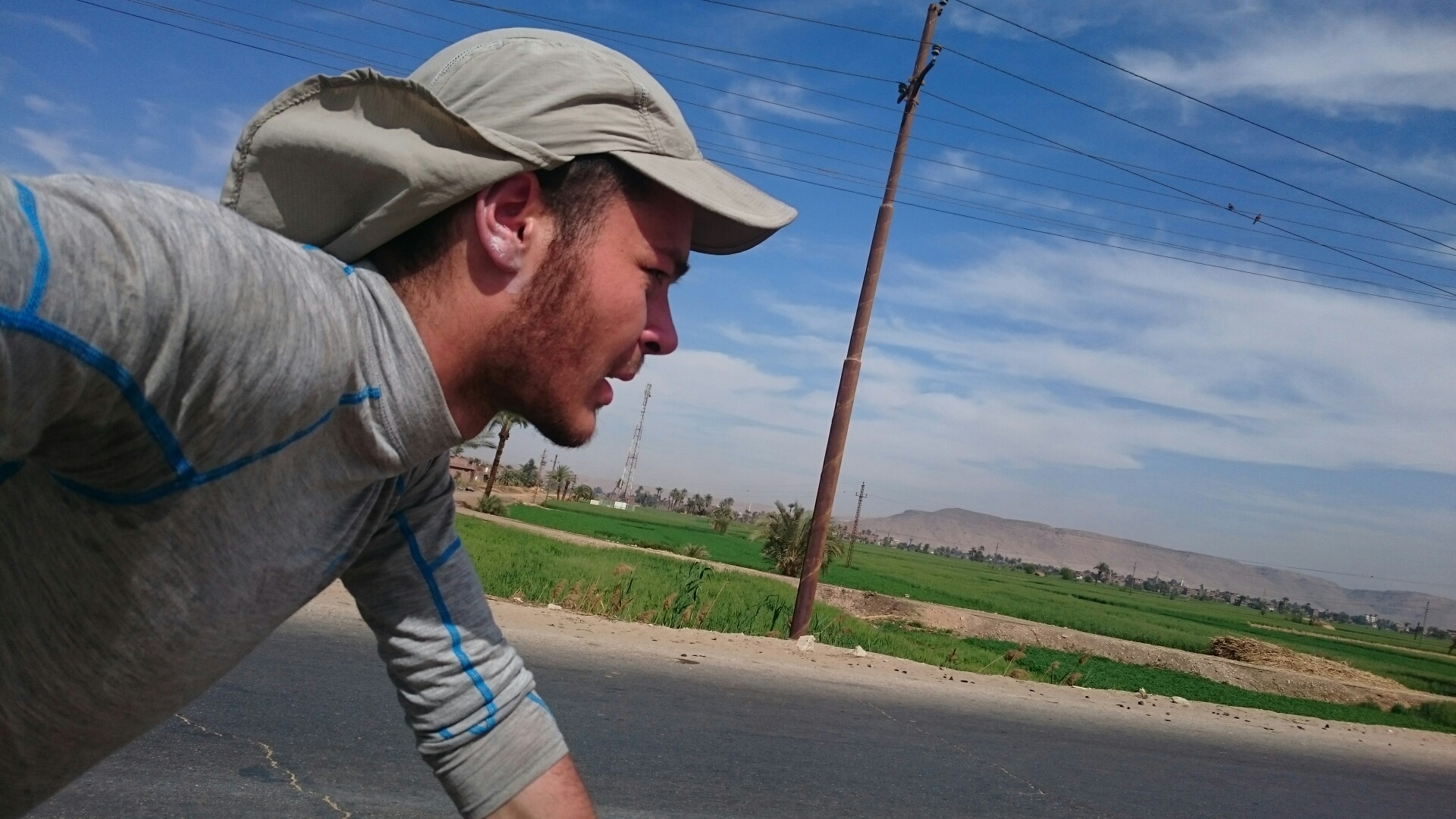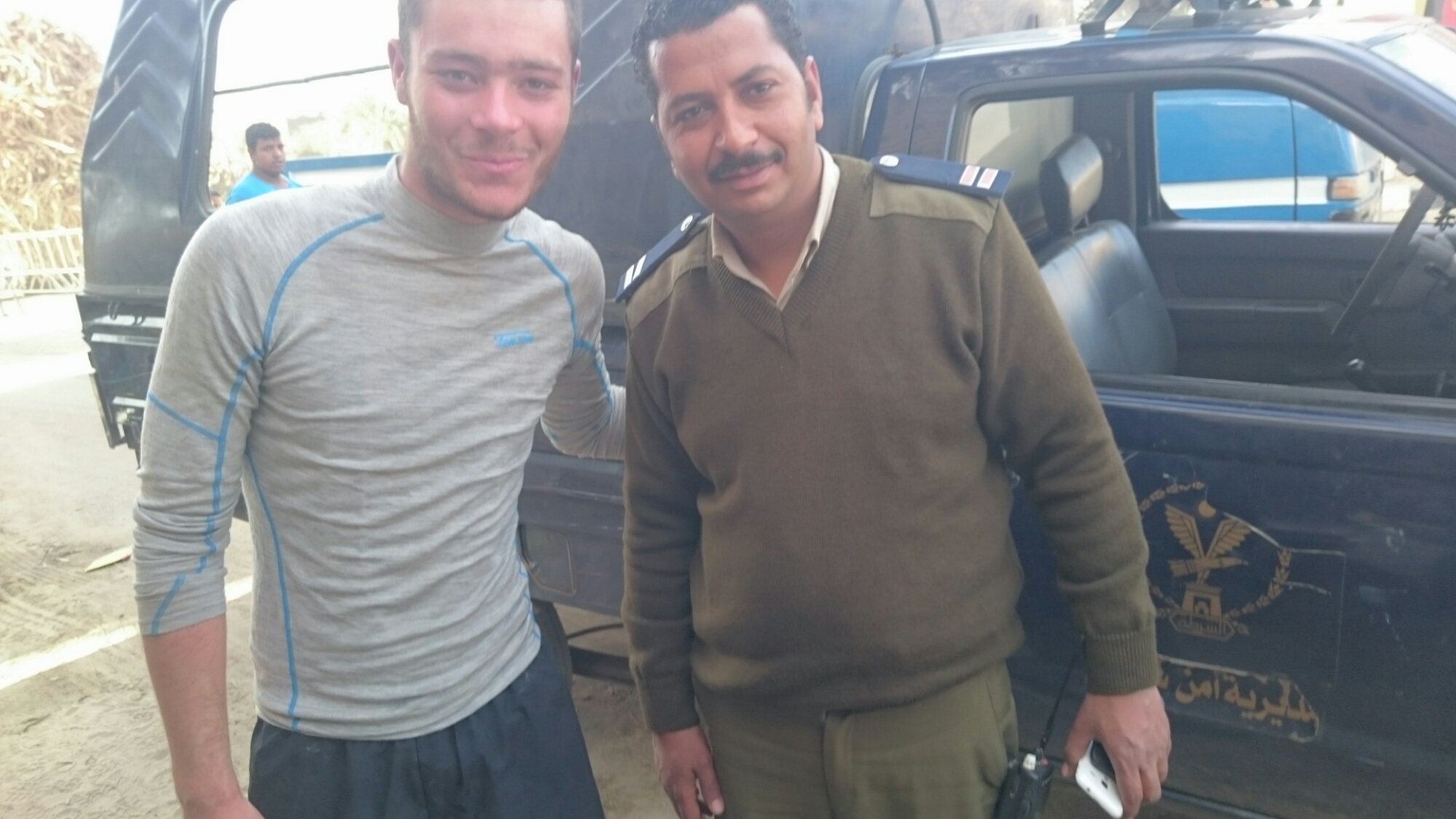 Dagens begivenheder kommer i massevis, de bliver derfor remset op i punktform. Først sættes stemningen lige, Nilen Egypten, høj sol, 26 grader, grønne marker, glade vinkende mennesker i de uendeligt mange sprudlende små byer der råber “welcome to Egypt” eller “whatisyourname” efter den hvide (snart helt røde) cyklist, hver halve time passerer et tog direkte ud af ‘slumdog millionaire’ med mennesker hængende ud af døre og vinduer, bag de høje marker er de de hvid-gule bjerge der omkranser Nildalen synlige.